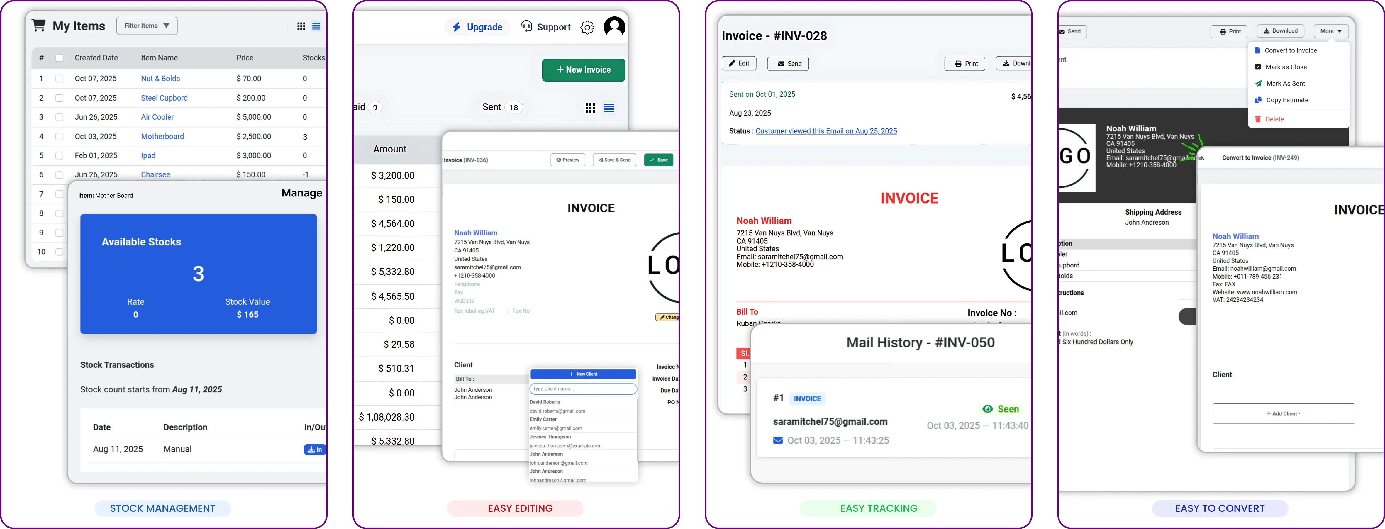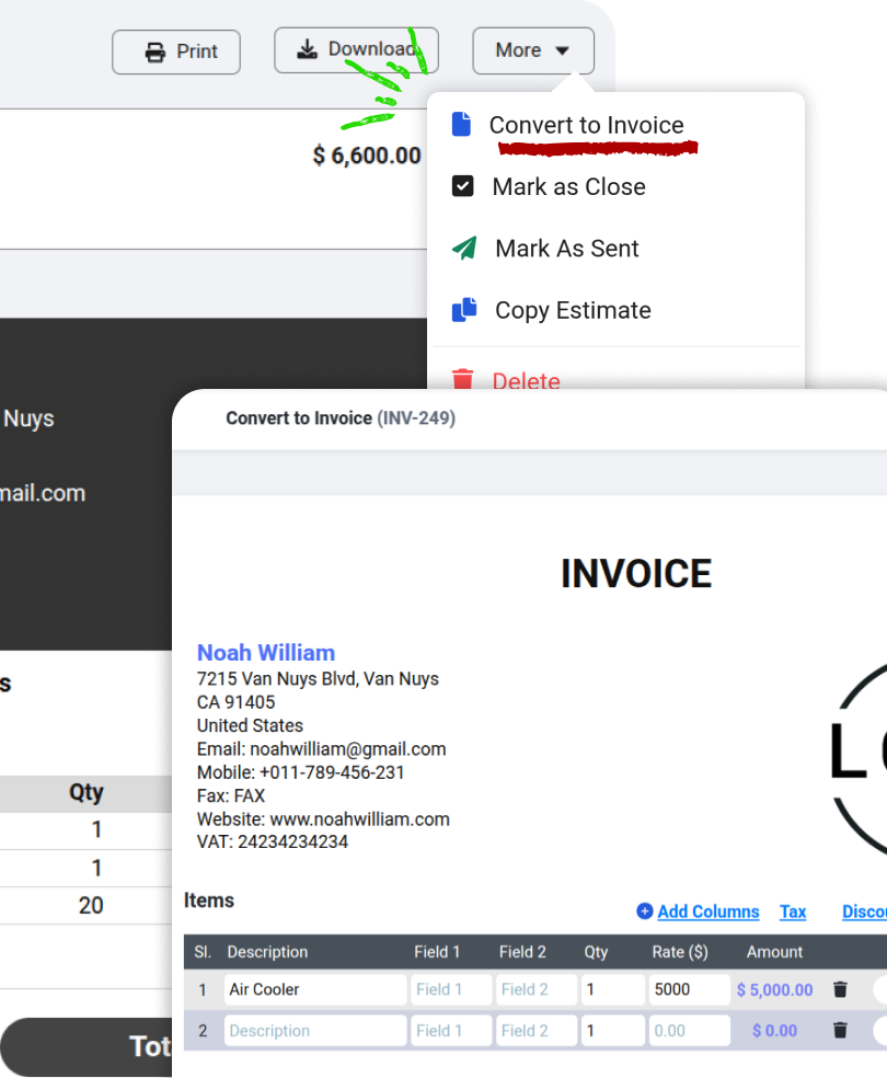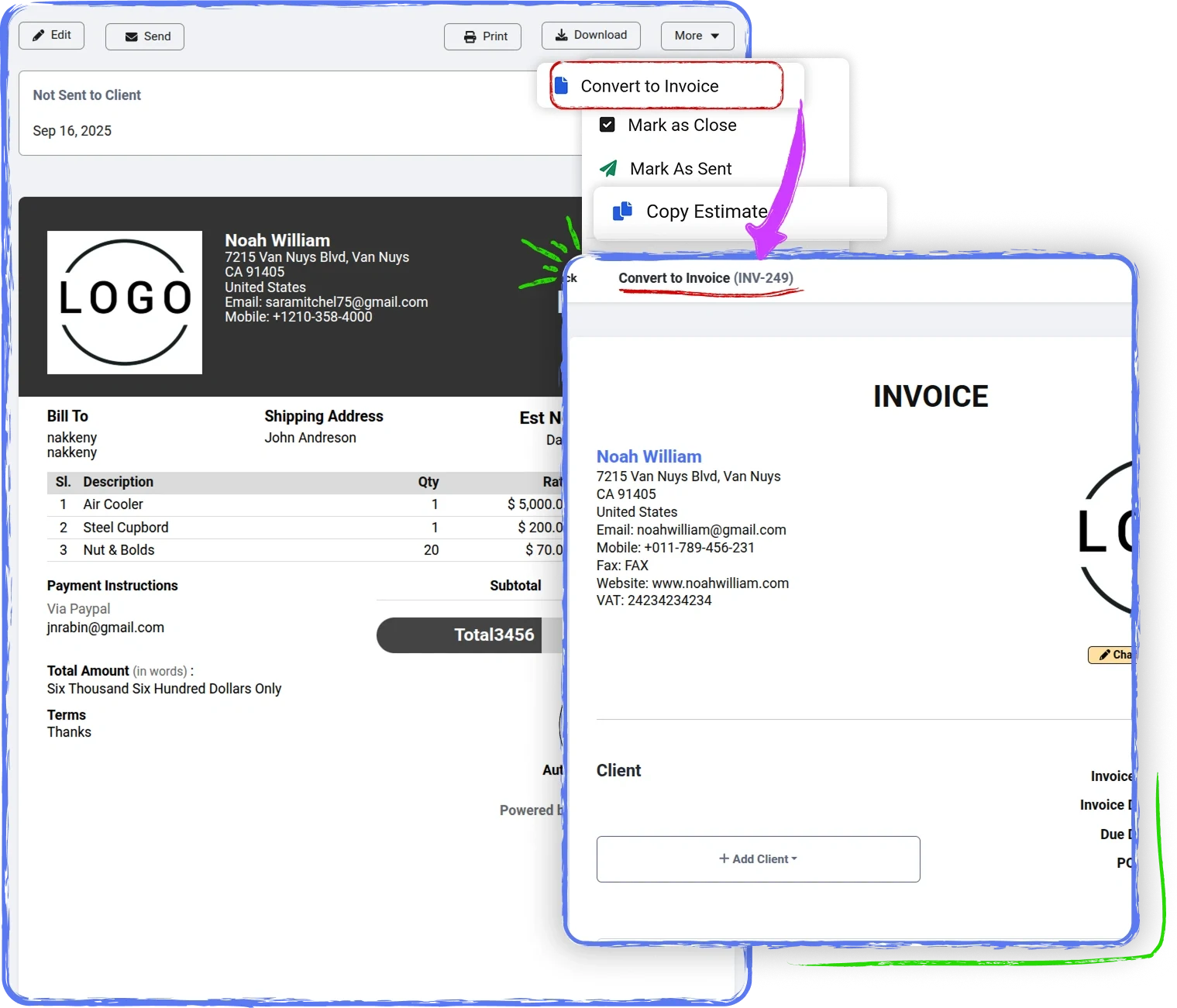 Our user-friendly interface allows you to quote the amount for your project with accuracy and professionalism. Once the client approves the estimate, you can convert it into a fully detailed invoice within a snap—no need for manual data re-entry.