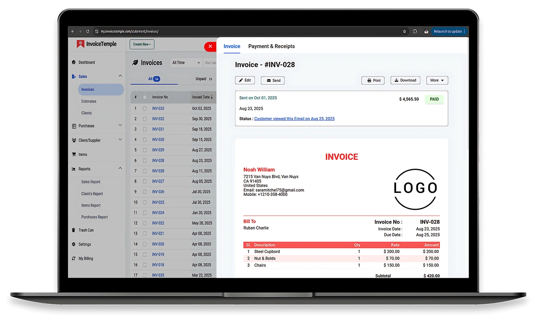 InvoiceTemple is now available on a dual platform, a web console as well as an Android app. Handle your invoicing with unmatched flexibility. Create, send, and get paid even while chilling at your vacation.