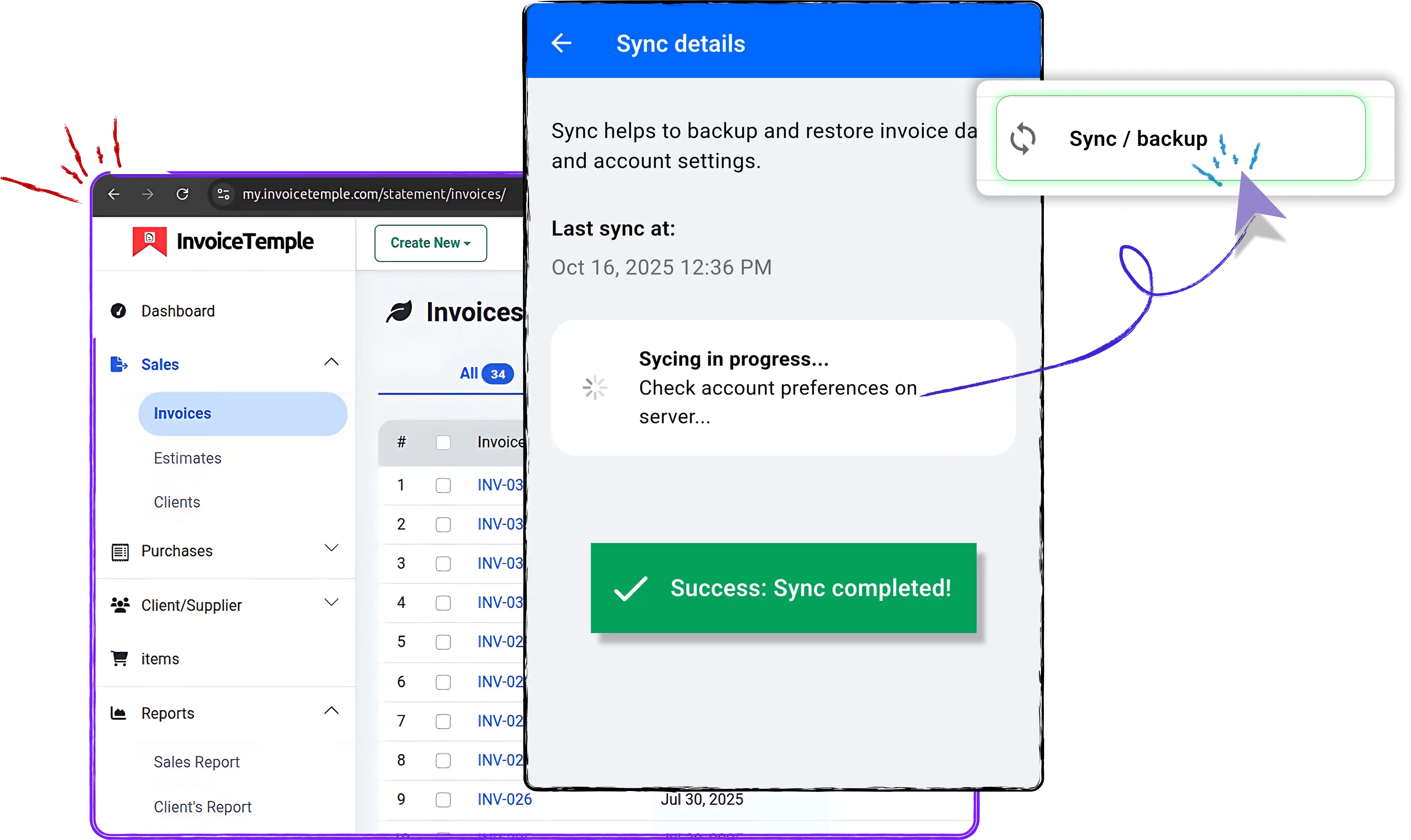 It is very handy to draft your invoices while traveling and send them directly to your customers. Invoices are backed up automatically at regular intervals of time. Moreover, our software lets you synchronize between the web application and other devices. So, you can switch between both devices.