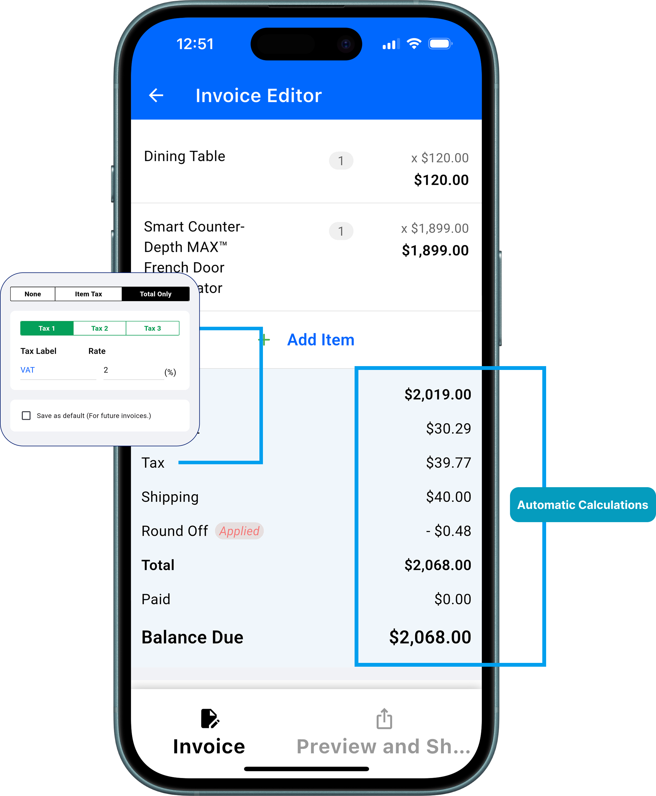 Create an error-free invoice with automatic calculations, maximized accuracy, and real-time updates on your iPad or iPhone with the InvoiceTemple app.