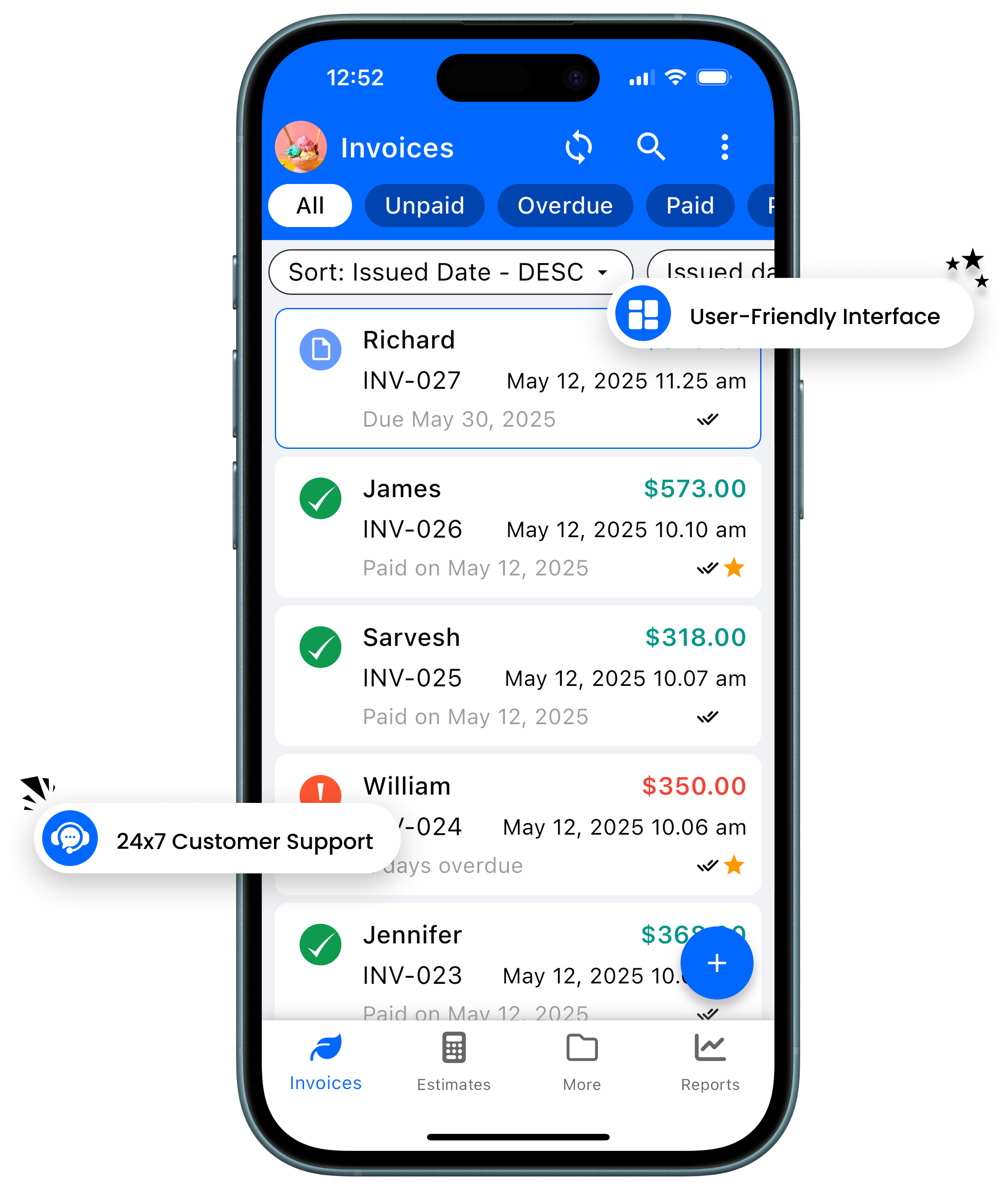 InvoiceTemple empowers business owners to manage all core business operations from their iPhone or iPad, offering unmatched convenience and control. Whether it's creating invoices, estimates, or purchase orders; managing clients; handling business accounts; or monitoring inventory, all such activities are easily done by the InvoiceTemple app