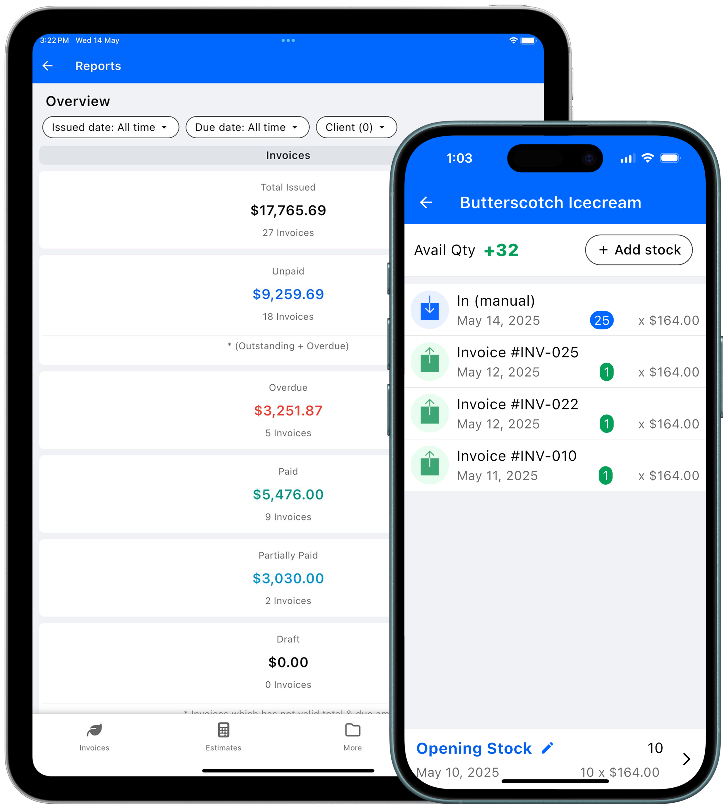 The InvoiceTemple app for the iOS platform syncs the data across all devices, passing real-time updates.